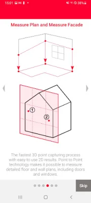 Measure Plan is a feature that supports P2P technology, making it possible to create detailed floor or wall plans, including doors and windows. These plans can then be exported as a DXF or DWG file into a preferred CAD solution.