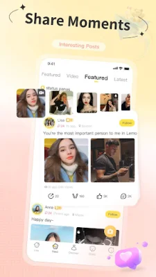 Another feature of Lemo is Feed, where you can share moments from your life with the community you are in. This allows you to connect with others and get to know them better by sharing your experiences and interests. It's a great way to stay connected and make new friends.