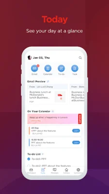 The Today page is where employees can view and manage their emails and events, which are synchronized with their Office 365 account. It also includes two efficiency tools, To-do and Task, to help employees stay focused and productive.