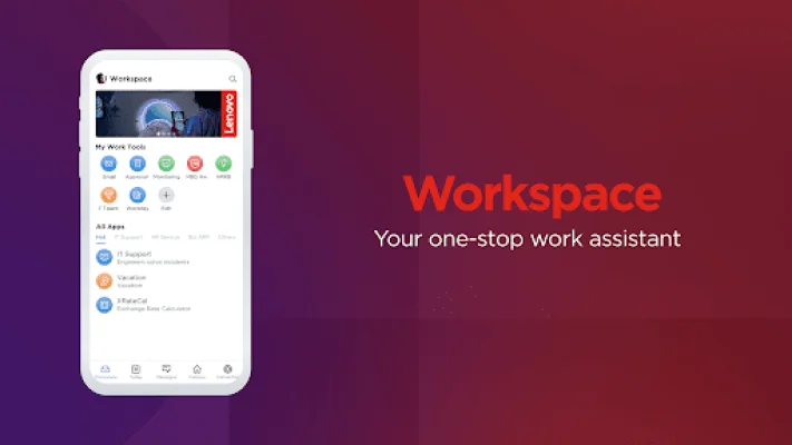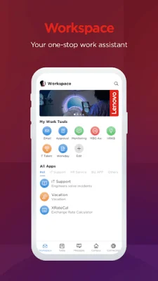 The Workspace page is where employees can customize their frequently used work tools, such as approval and HRKB, and access various Lenovo work apps, including IT service, HR service, and Biz apps. This allows for a more efficient and streamlined work experience.