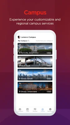 The Campus page offers customized and local campus services, such as Campus Info, Space Utilization, and Lenovo News. Employees can also use MyHub to book conference rooms, with the booking system synchronized with Outlook for convenience.