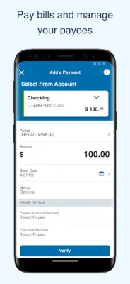 Once registered, users can easily manage their accounts by viewing balances and transaction details. They can also schedule or modify one-time payments, view payment history and scheduled payments, and add, edit, or delete payees for BillPay. The app also allows for the setup and modification of recurring BillPay payments.