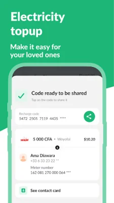 In addition to international calls and mobile top-ups, Libon also offers the option to top up family members' electricity accounts. This can be done from anywhere, without the need to go to a store. Users simply need to select the recipient's phone number, enter their meter number, and confirm the purchase. The generated code can then be sent to the recipient for them to use on their electricity meter.