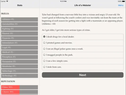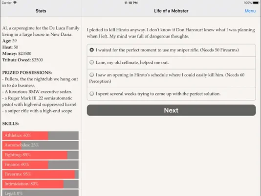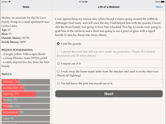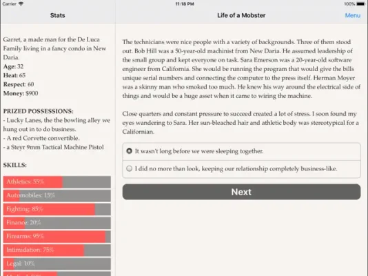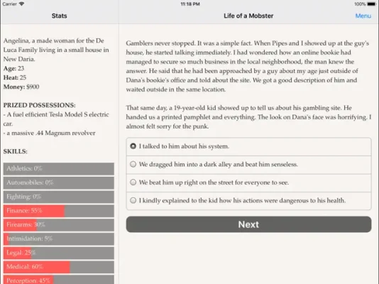 "Life of a Mobster" is an exciting and immersive interactive novel that puts you in control of the story. This game is completely text-based, meaning there are no graphics or sound effects, allowing your imagination to run wild and shape the outcome of the game. With endless possibilities and outcomes, the choices you make will determine the path your character takes in this thrilling world of organized crime.