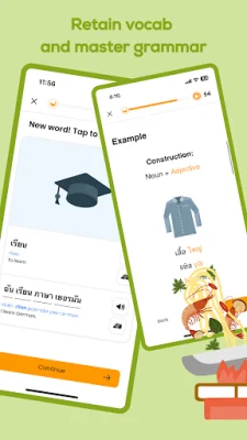 In addition to lessons, Ling also offers a variety of fun and interactive games and activities to help users practice and reinforce their language skills. These include matching images with vocabulary words, sorting jumbled sentences, completing dialogues, and even practicing real conversations with an AI chatbot. The app also provides instant feedback on pronunciation and allows users to trace Thai script with their finger.