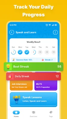 The app offers multiple learning modes for real-world speaking practice. Users can choose from job interview questions, IELTS-style audio, or simply speaking English sentences aloud. The AI Tutor provides feedback and ratings to help users improve their confidence. Additionally, the app has a vocabulary builder feature that introduces new words daily with clear definitions and examples to help users understand and use them in real conversations.