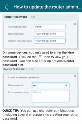 For security purposes, it is recommended to regularly update the router's admin password. The application includes instructions for doing so, ensuring that the router remains protected from unauthorized access.