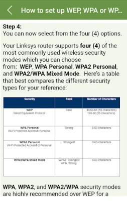 In addition to security settings, the app also provides guidance on how to set up different types of wireless security, such as WEP, WPA, or WPA2. This can be useful for users who want to customize their security settings to fit their specific needs.