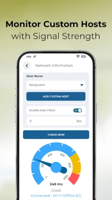 The application's core tools include dual signal tracking, which allows users to view the strength of both SIM 1 and SIM 2 cellular connections, as well as Wi-Fi, in one dashboard. The signal strength is displayed in dBm values with color ratings for easy interpretation. The host and latency tester feature allows users to perform instant or scheduled checks to custom hosts, showing response times for both mobile data and Wi-Fi connections. Users can also set auto-check intervals for continuous monitoring.