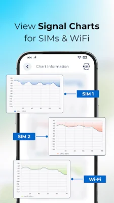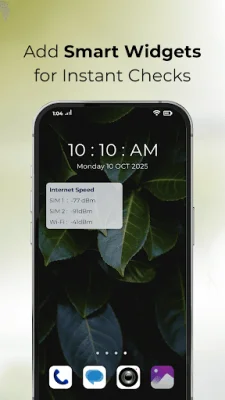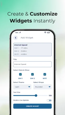 Live signal charts provide dynamic line graphs that are updated in real-time, allowing users to track signal fluctuations. The data can be reset when changing locations or networks, and users can compare the stability of their SIM and Wi-Fi connections side by side. The application also offers a customizable home widget that can be added to the home screen for quick visibility. Users can personalize the theme, shape, and font size of the widget, and enable live updates for continuous signal refresh without opening the app.