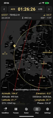 The main features of the app include predicting satellite positions and passes for up to 10 days, displaying a list of currently active and upcoming satellite passes, showing the progress of active passes, polar trajectory, and transceiver information, displaying satellite positional data, footprint, and ground track on a map, and allowing for custom TLE satellite data import through Three Line Element .txt files. The app also operates offline, with weekly TLE data updates recommended for optimal performance.