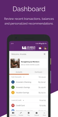 The LAFCU Mobile app is a convenient and secure way for members of Los Angeles Federal Credit Union to manage their finances. With a user-friendly dashboard, you can easily view all of your accounts in one place, including available funds, upcoming payments, deposits, and savings goals. The app also provides personalized recommendations to help you make the most of your money.