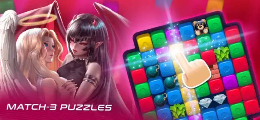 LoveNest is a virtual dating game where you get to choose between an innocent Angel or a sinful Demon in a battle between Heaven and Hell. The game features over 400 handmade match-3 puzzles that you must solve to unlock new heavenly pick-up lines, exchange unholy pictures, and uncover the mystery of celestial meetings. Each character has their own unique story and engaging route, with between 5,000 to 10,000 words each. You can also unlock 5 pictures per character by solving puzzles and getting higher scores.