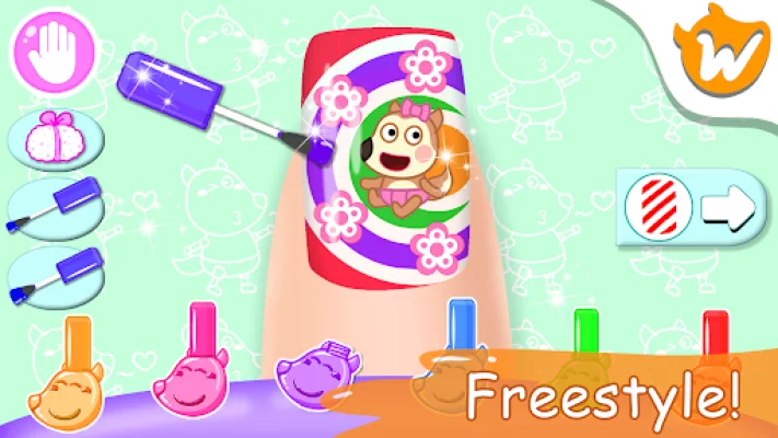 Get ready to create spooky and fun manicures with Lucy from Wolfoo World! This Halloween-themed application allows you to use your imagination and design eerie nail art using a variety of bewitching polish colors, spooky stickers, and creepy textures. With over 7 Halloween-inspired colors to choose from, including pumpkin orange and ghostly white, you can paint your nails to match the Halloween spirit. Lucy is waiting for you in the Halloween-themed Salon, so let's get started!