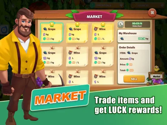 To get started, simply drag your fingers to build your farm and start planting those grapes. As your farm grows, you can produce your own wine and trade it with others, expanding your reach and increasing your profits. And with the option to upgrade your land and trading market, you can strategically manage your trading to maximize your income. It's like running a real business, but with the added fun of farming and trading!