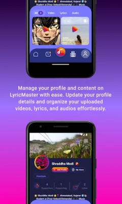 Your profile on LYRICMASTER is your personal space to customize and showcase your talent. You can add a cover photo, view your uploaded videos, lyrics, and audio. You also have the option to edit your profile, manage drafts, and add links to your store. Engaging with the community is also made easy with features like liking, commenting, and sharing posts and videos. You can also discover new music, support fellow artists, and grow your fan base on this platform.