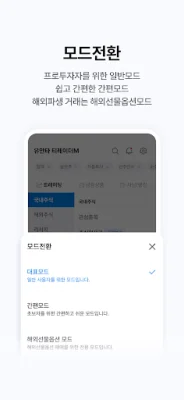 이 앱의 주요 기능 중 하나는 모드전환 기능입니다. 사용자는 프로투자자를 위한 일반모드, 쉽고 간편한 간편모드, 해외선물옵션 거래를 위한 해외선물옵션모드 중 선택할 수 있습니다. 또한 관심종목 기능을 통해 서버와 연동되는 나만의 맞춤 관심종목을 설정할 수 있습니다.