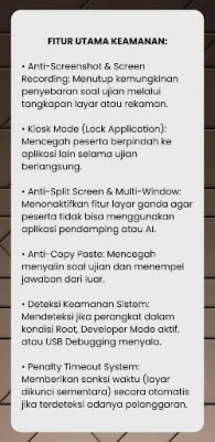 Fitur utama keamanan dari aplikasi M-SEB adalah untuk mencegah penyebaran soal ujian secara tidak sah. Aplikasi ini memiliki beberapa fitur seperti anti-screenshot dan screen recording yang akan menutup kemungkinan peserta ujian untuk mengambil tangkapan layar atau merekam layar selama ujian berlangsung. Selain itu, aplikasi ini juga memiliki fitur kiosk mode yang akan mengunci aplikasi sehingga peserta tidak dapat berpindah ke aplikasi lain selama ujian berlangsung. Fitur anti-split screen dan multi-window juga akan menonaktifkan kemampuan layar ganda sehingga peserta tidak dapat menggunakan aplikasi pendamping atau AI selama ujian berlangsung. Aplikasi ini juga memiliki fitur anti-copy paste yang akan mencegah peserta untuk menyalin soal ujian atau menempel jawaban dari sumber luar. Selain itu, aplikasi ini juga memiliki deteksi keamanan sistem yang akan mendeteksi apakah perangkat yang digunakan dalam kondisi root, developer mode aktif, atau USB debugging menyala. Jika terdeteksi adanya pelanggaran, aplikasi ini juga memiliki fitur penalty timeout system yang akan memberikan sanksi berupa waktu layar yang dikunci secara otomatis.