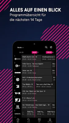 With MagentaTV, you have the flexibility to watch live or time-shifted TV. You can choose when your favorite programs air, and even record individual shows or entire series with 100 hours of online storage. The app also offers a comprehensive search function, making it easy to find content quickly. And with convenient features like Restart, Timeshift, and a free overview of available content, your viewing experience is made even more comfortable. The electronic program guide (EPG) allows you to see what's currently live on TV and what's coming up in the next 14 days.
