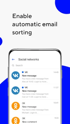 The app also offers push notifications for new emails, which can be filtered by time, services, folders, or personal preferences. Users can also access emails offline through cached emails stored in the phone's memory.