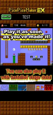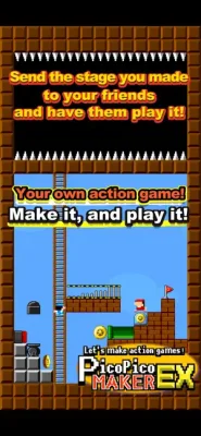 You can also share your own stages with friends and family by sending them the URL of your stage via email. They will need to download the app in order to play your stage. You can also post your stage on social media platforms like Twitter, Facebook, and LINE. In your free time, you can also search online for "PicoPicoMaker" and discover new stages created by other users from all over the world. This game has retro-looking pixel graphics that will bring back nostalgic memories for many players. Connect with people from all over the world and start your global action game adventure with PicoPicoMaker!