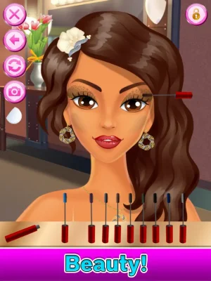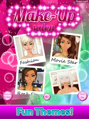 This application offers a variety of makeover themes to choose from, including Fashion, Movie Star, Rockstar, and Wedding. Each theme has its own unique style, accessories, and soundtrack. Users can start by selecting a model and then customize their skin tone, eye color, hair style, outfits, accessories, jewelry, and more. They can also apply makeup such as lipstick, powder, eye-shadow, eye liner, mascara, and sparkle to complete the look. The best designs can be saved and users can easily remove old makeup with the Makeup remover or start over with the reset button. With endless combinations, users can have fun creating different looks.