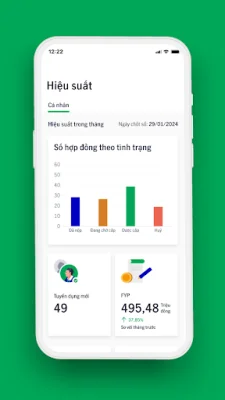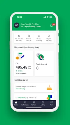 M-PA còn là một công cụ hữu ích để bứt phá năng suất cá nhân và đội nhóm. Thông tin về các chỉ tiêu hiệu suất đội nhóm FYP, FYC, APE, Tỷ lệ duy trì năm 02, số lượng đại lý đang hoạt động và Manulife Pro theo tháng được hiển thị rõ ràng, giúp nhân viên đánh giá và cải thiện hiệu suất làm việc.