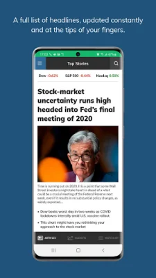 The app features a variety of sections, including Business News & Analysis, which provides the latest stock market, finance, business, and investing news from MarketWatch. Users can also access personal finance, technology, politics, energy, retail, and retirement planning news and insights. The Top Stories bar is interactive and allows users to access a fully customizable drop-down menu featuring other news channels, such as U.S. Markets, Investing, and Personal Finance.