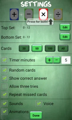 One of the main features of this application is the ability to edit the top and bottom number ranges for each math operation. This allows users to customize the difficulty level according to their own abilities and needs. For addition and subtraction, the number ranges can be set from 0 to 50, while for multiplication and division, the range is from 0 to 20.