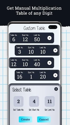 With the option to create and store customized tables, users can focus on specific ranges or numbers that they need to practice. This feature also allows for easy access to previously created tables for future use. The app's user-friendly interface and interactive features make it a convenient and efficient tool for learning and practicing multiplication tables.