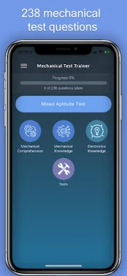 Preparation is crucial when it comes to taking an aptitude test. It can make the difference between passing and failing. That's why the Mechanical Test Trainer is here to help you achieve the best preparation possible. With this application, you can practice over 200 questions divided into 4 categories, giving you a comprehensive review of the material you need to know for your test.