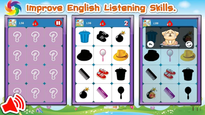 The game features cute images of animals, fruits, cars, and objects on memory cards. There are three different levels of gameplay: Easy, Normal, and Hard, each with 120 levels. This matching game includes various types of cards such as image cards, bomb cards, shadow cards, word cards, and pure sound cards. Your goal is to match 2 or 3 cards to progress through the levels.