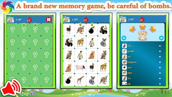 A brand new memory game is now available for you to play! But be careful, there are bombs involved. This game is an easy and fun way to train your memory and improve your skills. It is designed to help you develop your memory, focus, problem solving, and multitasking abilities. Plus, all the cards are pronounced in English, so you can even improve your listening skills while playing.