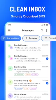 Experience the power and simplicity of SMS Messages, with fast performance, spam protection, and personalized features all in one private inbox. The app's intelligent SMS Organizer automatically categorizes your messages into Personal, Transactions, OTPs, and Promotions, ensuring that your most important messages are always front and center.