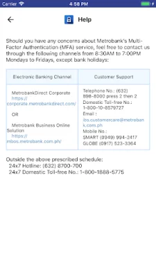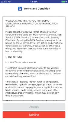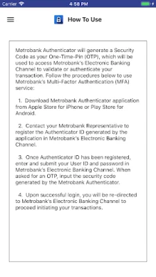 This application, called Metrobank Authenticator, allows users to generate a one-time use PIN code on their mobile device. This code is used in conjunction with the user's username and password to access Metrobank's Electronic Banking Channel and validate or authenticate transactions. This is done through Metrobank's Multi-Factor Authentication (MFA) service.