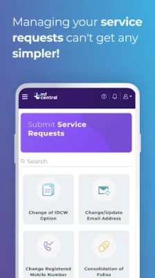 MFCentral offers a range of services to manage your mutual fund investments. This includes a detailed portfolio view, categorized by fund house and asset class, as well as the ability to make service requests such as changing IDCW option, updating personal information, and registering multiple bank mandates. You can also track the status of your requests, access unclaimed payouts, and view consolidated account statements.