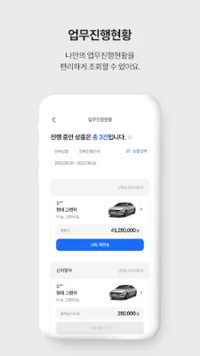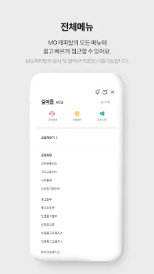The main features of this app include the ability to easily browse through various products offered by MG Capital, select and search for desired vehicles in multiple ways, and conveniently view personal work progress. Users can also quickly access all menus offered by MG Capital.