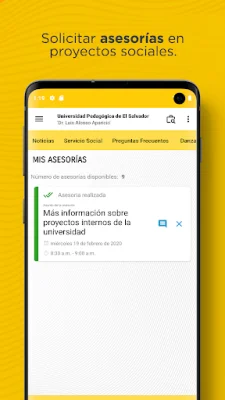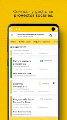Otra función importante de la aplicación es la posibilidad de conocer y gestionar proyectos sociales. Esto facilita la participación de los estudiantes en iniciativas que buscan mejorar la sociedad y promover un impacto positivo en la comunidad. Además, los estudiantes también pueden solicitar asesorías para estos proyectos, lo que fomenta una mejor comunicación y desarrollo de los mismos.