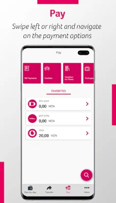 For quick and convenient payments, simply click on the "Pay" option in the navigation bar. This feature allows for payments such as Credelec, phone vouchers, TV packages, bill payments, and more. The "More" section offers additional operations such as reading and generating QR codes, savings, IZI withdrawals, requesting checkbooks, and sending invitations (for Prestige Customers only). Users can also access contacts, branches, and current exchange rates in this section.