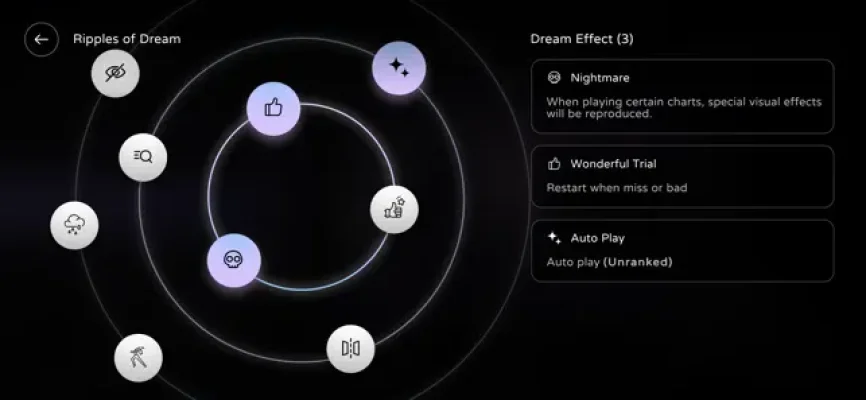 One of the unique features of this application is its dream replay mode. This mode adds an extra layer of challenge and fun to the game by incorporating dream-like ripples. Players can also customize their gameplay experience by choosing from different options such as "Wonderful Trial" for automatic restarts on missed notes, "Fade out" for increased difficulty, and "Downpour" for a chaotic gameplay with a massive number of raindrop notes.