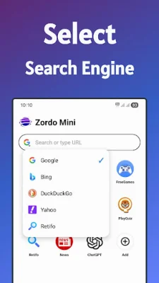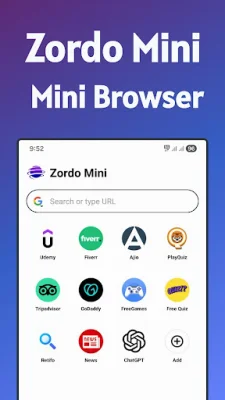 Zordo Mini is a mini browser application that offers a variety of features in a compact and efficient package. It is designed to provide fast searches, smooth browsing, and data-saving performance for all Android devices, including those with low RAM and affordable prices. The browser has an optimized engine that ensures quick page loading, smooth scrolling, and a clean interface for everyday use.
