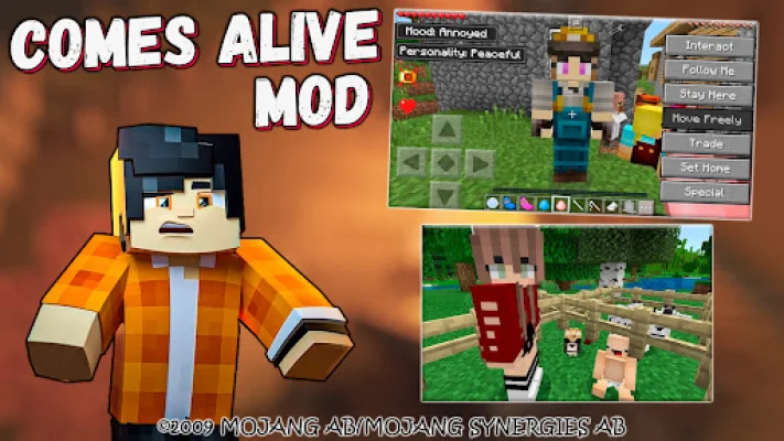 This application is a mod for the popular game, Minecraft. It adds a new feature called "Comes Alive" which allows players to interact with villagers in different ways. This is meant to solve the problem of feeling lonely in the game. The mod also includes new skins for players to use. To use this mod, players must have the full version of Minecraft and set their world to survival mode.