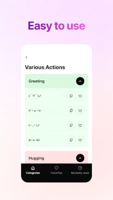 Each kaomoji on the app has two buttons - "Copy" and "Add to Favorites". By clicking the "Copy" button, users can quickly copy the kaomoji to their clipboard, making it available for use in text messages, social media, and other apps. All copied kaomojis can be found in the Recently Used screen, making it convenient for users to access them again.