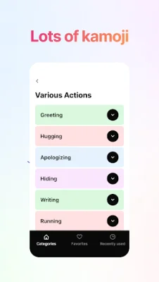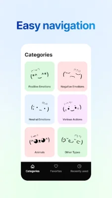 The app is designed to make it easy for users to access and use a vast collection of kaomojis, which are Japanese emoticons made up of characters and symbols. The app has three main screens - Home, Favorites, and Recently Used - that can be easily accessed through the Bottom Navigation menu. The Home screen is where users can find a variety of kaomojis grouped into categories and subcategories, making it easier to navigate and search for specific ones.