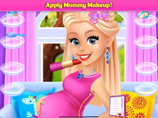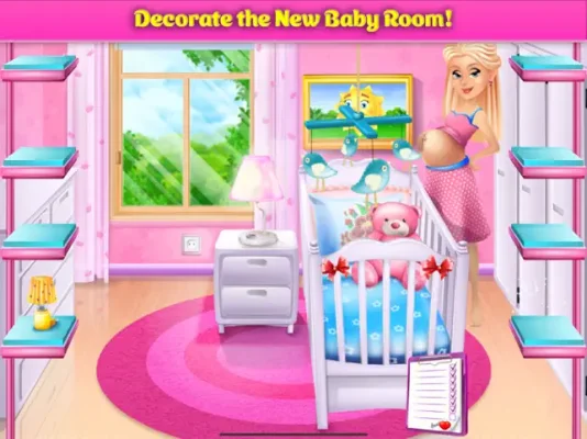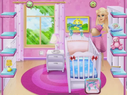 This application is designed to provide entertainment for children by allowing them to play different levels of activities with a mommy, daddy, and baby. Each level offers a unique and fun experience for the child to engage in. The first level focuses on helping the mommy look her best by applying makeup and brushing her hair. The second level involves decorating the nursery room on a sunny day, setting up the crib, and turning the lights on and off with a tap on the lamp.