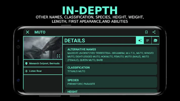 This application is a comprehensive guide to all the monsters featured in the Monsterverse franchise. It includes over 50 official Titans, including those from Skull Island and Hollow Earth. The app provides in-depth details about each Titan, including their origin, history, and iconic roars. Users can also browse through a gallery of images for each monster.