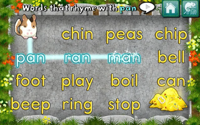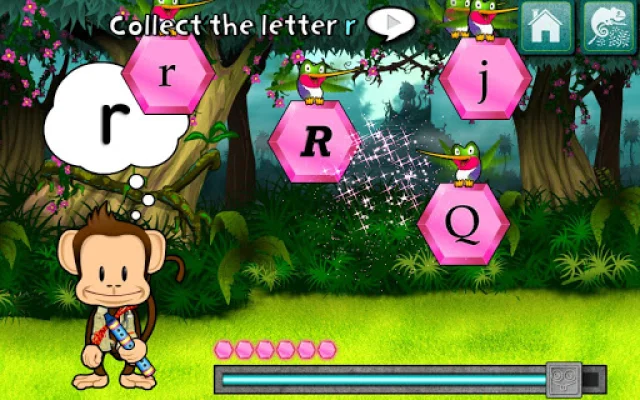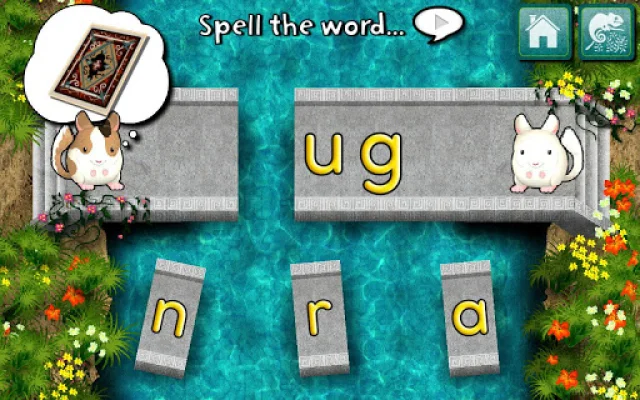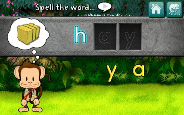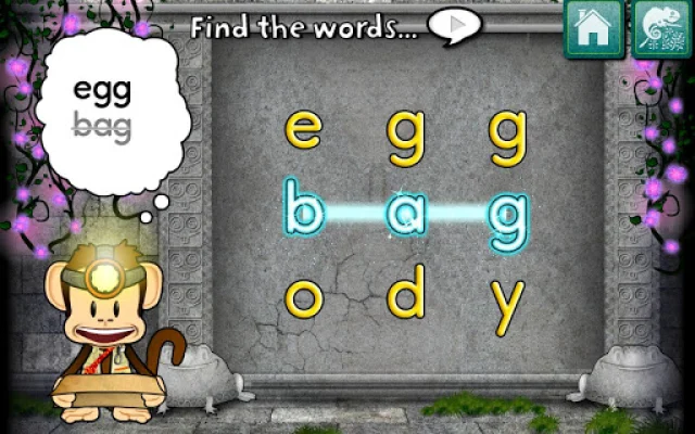 Each game in Monkey Word School Adventure has a unique concept and learning objective. For example, in "Spelling Stone," children use magic gold letters to solve puzzles and help Monkey with his spelling. "Sight Birds" focuses on letter recognition and sight words as children help Monkey collect gems from birds. "Letter Writing" teaches children how to write uppercase and lowercase letters by carving them into an ancient stone wall. "Phonics Bridge" uses the power of phonics to help two chinchillas cross a broken bridge. "Word Wall" challenges children to find words on a map to help Monkey solve a puzzle. And in "Rhyming Maze," children use words that rhyme to help a greedy chinchilla find treasure.