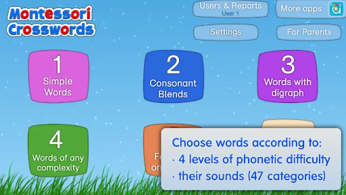 Montessori Words & Phonics offers three levels of difficulty, from simple CVC words to more complex phonics like long vowels and blends. Children can also choose words based on specific sounds, with 44 sound categories available. The app also includes fun and colorful visual effects that are displayed after a word is completed, making the learning experience enjoyable for children.