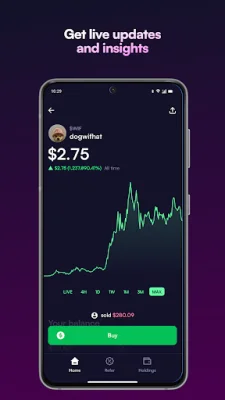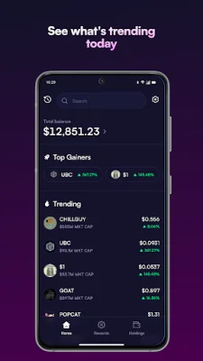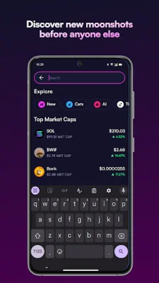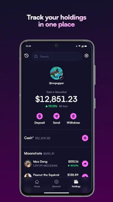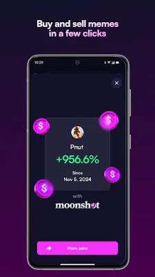 The app also features a section called "Find Moonshots" where users can see trending memes that people are buying the most. This allows users to stay updated on the latest trends and track their own holdings. They can also share their gains with friends after taking profits.