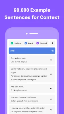 This application is designed to help users learn new words and improve their vocabulary. It contains a database of over 121,536 example sentences that provide context for the words, along with their pronunciations. This allows users to not only learn the meaning of a word, but also how it is used in a sentence and how it should be pronounced.